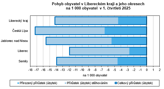 Do Libereckého kraje se v průběhu 1. čtvrtletí roku 2025 přistěhovalo 2 164 osob, tj. o 171 osob méně (-7,3 %) než ve stejném období roku 2024. Z ostatních krajů České republiky našlo bydliště v našem kraji 1 297 osob (meziročně o 84 osob a 6,1 % méně) a ze zahraničí 867 osob (-87 osob, -9,1 %). Z kraje se za stejné období vystěhovalo 3 248 osob, tj. meziročně o 460 osob (12,4 %) méně. Do jiných krajů Česka zamířilo 1 425 osob (-12 osob, -0,8 %) a do zahraničí 1 823 osob (-448 osob, -19,7 %). Celkově stěhováním náš kraj ztratil 1 084 obyvatel. Saldo zahraniční i vnitřní migrace bylo záporné a činilo -956 osob, resp. -128 osob.