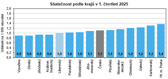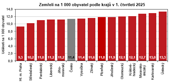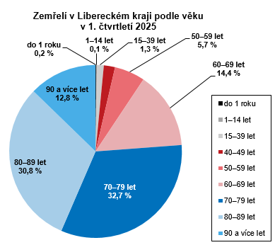 Během prvních tří měsíců roku 2025 v Libereckém kraji zemřelo 1 239 osob (z toho 657 mužů, tj. 53,0 % z celkového počtu zemřelých) a ve srovnání se stejným obdobím roku 2024 bylo vykázáno o 49 úmrtí méně (-3,8 %). V přepočtu na 1 000 obyvatel zemřelo 11,2 osob, tj. v rámci mezikrajského srovnání 4. nejnižší hodnota. Hrubá míra úmrtnosti se pohybovala v rozmezí od 9,3 ‰ v hlavním městě Praze do 13,3 ‰ v Ústeckém kraji. Nejvyšší hodnota tohoto ukazatele z pohledu okresů našeho kraje byla vykázána v okrese Česká Lípa (12,9 úmrtí na 1 000 obyvatel), nejnižší v okrese Liberec (10,0 ‰). Téměř jednu třetinu zemřelých v Libereckém kraji představovaly osoby ve věku 70–79 let, dalších 30,8 % připadlo na osoby ve věku 80–89 let. Mezi zemřelými však byly bohužel také 2 děti do 1 roku a 1 dítě ve věku 1–14 let. Kojenecká úmrtnost v našem kraji dosáhla 2,7 ‰.