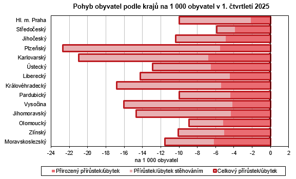 Ve srovnání se začátkem roku 2025 se počet obyvatel zjištěný k 31. 3. 2025 snížil také ve všech ostatních krajích Česka. Absolutně největší pokles vykázal Jihomoravský kraj (-4 450 osob, tj. -14,7 osob na 1 000 obyvatel), relativně pak kraj Plzeňský (-22,7 osob na 1 000 obyvatel, tj. -3 438 osob). Všechny regiony pak obyvatele ztratily jak přirozenou měnou, tak stěhováním. V 5 krajích se na úbytku populace vyšší měrou podílela přirozená měna (kraj Středočeský, Ústecký, Olomoucký, Zlínský a Moravskoslezský), ve zbývajících 8 regionech měla výraznější vliv migrace.