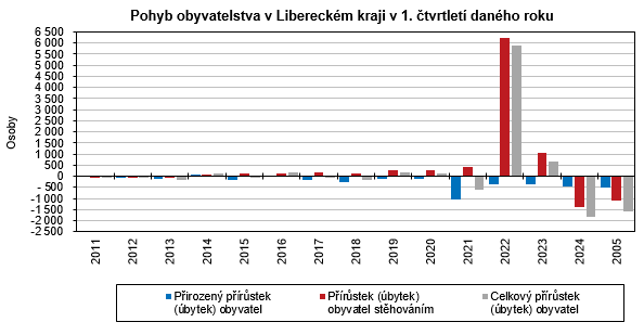 Pohyb obyvatelstva v Libereckém kraji v 1. čtvrtletí 2025