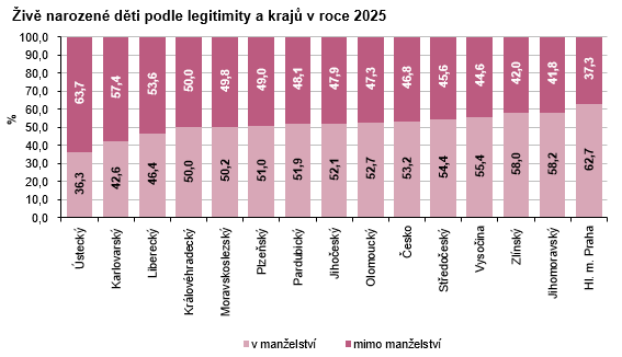 V rámci našeho kraje se nejméně dětí mimo manželství narodilo v okrese Semily (50,2 %), nejvíce v okrese Česká Lípa (59,2 %). V porovnání 77 okresů Česka se tak na nejvyšší 50. příčce umístil okres Semily, následuje okres Liberec (52. příčka, 51,1 %) a okres Jablonec nad Nisou (64. příčka s 55,5 %). Okres Česká Lípa se umístil na 69. místě a podíl dětí narozených nesezdaným párům je tak v tomto regionu v rámci Česka 9. nejvyšší. Napříč Českem byl pak nejnižší podíl dětí narozených mimo manželství evidován v okrese Brno-venkov (37,1 %), nejvyšší v okrese Most (69,7 %).