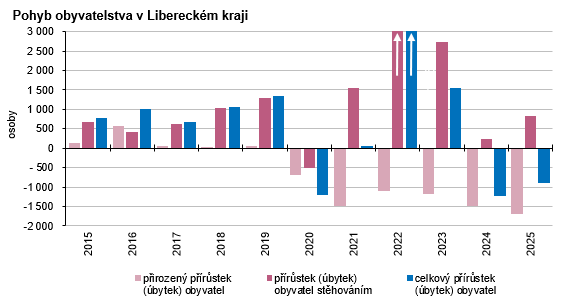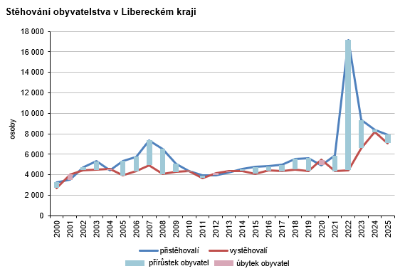 Do Libereckého kraje se v průběhu roku 2025 přistěhovalo 7 915 osob, tj. o 499 osob méně (-5,9 %) než v roce 2024. Z ostatních krajů Česka našlo bydliště v našem kraji 4 309 osob (meziročně o 32 osob a 0,7 % méně) a ze zahraničí 3 606 osob (-467 osob, -11,5 %). Z kraje se v loňském roce vystěhovalo 7 098 osob, tj. meziročně o 1 073 osob (13,1 %) méně. Do jiných krajů Česka zamířilo 4 703 osob (-96 osob, -2,0 %) a do zahraničí 2 395 osob (-977 osob, -29,0 %). Celkově stěhováním náš kraj získal 817 obyvatel. Saldo zahraniční migrace bylo kladné a činilo 1 211 osob, saldo vnitřní migrace bylo záporné a dosáhlo 394 osob.