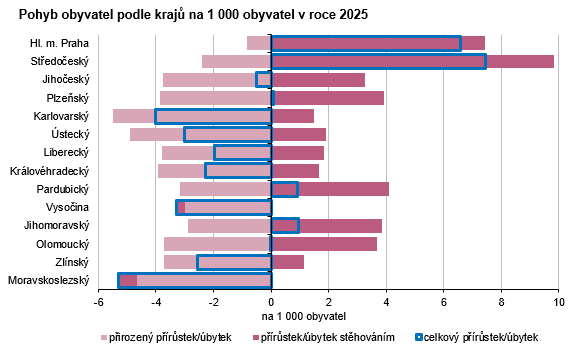 Z pohledu krajů Česka se počet obyvatel v průběhu roku 2025 snížil v 10 krajích. Výjimku představovalo hlavní město Praha (+9 204 osob, tj. +6,6 osob na 1 000 obyvatel), Středočeský (+10 919 osob, tj. +7,4 ‰), Jihomoravský (+1 173 osob, tj. +1,0 ‰), Pardubický (+481 osob, tj. +0,9 ‰ a Plzeňský kraj (+43 osob, tj. +0,1 ‰) Absolutně i relativně největší pokles vykázal Moravskoslezský kraj (-6 233 osob, tj. -5,3 osob na 1 000 obyvatel), nejnižší Olomoucký kraj (-20 osob, -0,0 ‰). Všechny regiony vykázaly zápornou hodnotu přirozené měny obyvatel. Migrační saldo vykázalo kladné hodnoty ve 12 regionech, nejvýrazněji přibylo obyvatel stěhováním ve Středočeském kraji (+14 436 osob, tj. 9,8 ‰). Naopak kraj Moravskoslezský a Kraj Vysočina ztratily obyvatele jak přirozenou měnou, tak stěhováním.