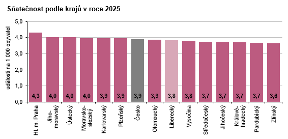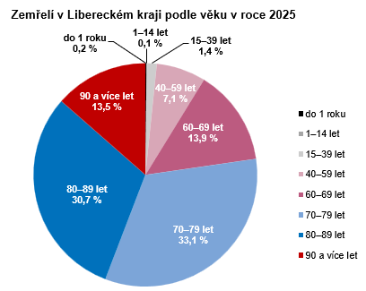 V loňském roce v Libereckém kraji zemřelo 4 756 osob (z toho 2 491 mužů, tj. 52,4 % z celkového počtu zemřelých) a ve srovnání s rokem 2024 bylo vykázáno o 26 úmrtí více (+0,5 %). V přepočtu na 1 000 obyvatel zemřelo 10,6 osob, tj. v rámci mezikrajského srovnání 6. nejnižší hodnota. Hrubá míra úmrtnosti mezi kraji se pohybovala v rozmezí od 8,7 ‰ v hlavním městě Praze do 11,7 ‰ v Ústeckém kraji. Nejvyšší hodnota tohoto ukazatele z pohledu okresů našeho kraje byla v loňském roce vykázána v okrese Česká Lípa (11,5 úmrtí na 1 000 obyvatel), nejnižší v okrese Liberec (9,9 ‰). Jednu třetinu zemřelých v Libereckém kraji představovaly osoby ve věku 70–79 let, dalších 30,7 % připadlo na osoby ve věku 80–89 let. Mezi zemřelými však bylo bohužel také 8 dětí do 1 roku a 5 dětí ve věku 1–14 let. Kojenecká úmrtnost v našem kraji dosáhla 2,6 ‰ a je mezi ostatními regiony 6. nejvyšší.
