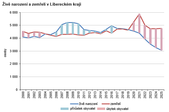 Během roku 2025 se v Libereckém kraji živě narodilo 3 055 dětí, meziročně tak přišlo na svět o 198 dětí (6,1 %) méně a porodnost tak poklesla po deváté v řadě. V přepočtu na 1 000 obyvatel kraje tak připadlo 6,8 narozených dětí, tj. po kraji Karlovarském (6,2 dětí) a Ústeckém (6,8 dětí) 3. nejnižší hodnota. Nejvíce dětí se z pohledu tohoto ukazatele narodilo v hlavním městě Praze (7,8 ‰). V rámci Libereckého kraje bylo nejvíce živě narozených dětí evidováno v okrese Liberec (1 262 dětí, tj. 7,0 dětí na 1 000 obyvatel), nejméně absolutně v okrese Semily (500 dětí, tj. 6,9 ‰), nejméně relativně pak v okrese Česká Lípa (6,5 ‰, tj. 660 dětí).