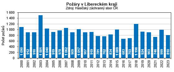 V průběhu roku 2023 vzniklo na území Libereckého kraje 810 požárů, přímá škoda na 1 událost dosáhla 383,8 tis. Kč. Při požárech bylo zraněno 88 osob, 5 osob zemřelo.