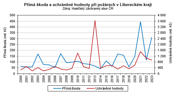 Podle údajů Hasičského záchranného sboru České republiky počet požárů, které vznikly na území Libereckého kraje během roku 2023, meziročně poklesl o 189 událostí (-18,9 %) na 810 událostí. Přímá škoda způsobená těmito požáry se proti roku 2022 naopak o 194,7 mil. Kč zvýšila a dosáhla 310,9 mil. Kč. Uchráněné hodnoty ve výši 926,2 mil. Kč (tj. meziročně o 130,9 mil. Kč méně) pak převýšily přímé škody trojnásobně.