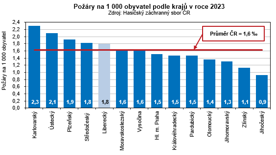 Přesnější pohled na četnost požárů v jednotlivých regionech nabízí jejich přepočet na 1 000 obyvatel. Z tohoto pohledu bylo nejvíce požárů vykázáno v Karlovarském kraji (2,3 ‰), nejméně v kraji Jihočeském (0,9 ‰). Hodnota za Liberecký kraj, a to 1,8 požárů na 1 000 obyvatel, byla 5. nejvyšší. Průměr za Českou republiku pak dosáhl 1,6 ‰.