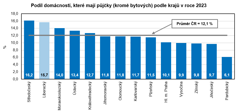 V roce 2023 mělo v Libereckém kraji půjčky (kromě bytových) 15,7 % domácností (2. nejvyšší podíl mezi kraji). Pro 5,8 % domácností bylo jejich splácení velkou zátěží, pro 9,0 % určitou zátěží a pro 0,8 % domácností nebyla vůbec zátěží. Z mezikrajského pohledu bylo nejvíce domácností zatížených půjčkou vykázáno ve Středočeském kraji (16,2 %), nejvyšší podíl domácností, pro které představovalo splácení půjček velkou zátěž, však vykázal právě náš region. Naopak v Pardubickém kraji bylo půjčkou zatíženo pouze 6,1 % domácností. Nejnižší podíl domácností, pro které bylo splácení půjček velkou zátěží, však bylo evidováno v hlavním městě Praze (1,3 %).