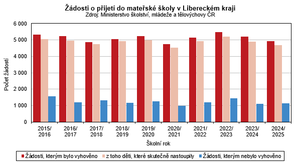 Ve školním roce 2024/2025 je v Libereckém kraji evidováno 232 mateřských škol, tj. o dvě méně než v minulém školním roce. Přesto se celkový počet tříd nezměnil a činil 738 tříd. Uvedené školky a třídy ve sledovaném roce navštěvuje 14 714 dětí, tzn. meziročně o 444 dětí méně (-2,9 %). Na jednu třídu tak v průměru připadá 19,9 dětí, tj. o 0,6 dítěte méně než v předchozím školním roce. Ve struktuře dětí z pohledu pohlaví z 51,3 % převažují chlapci. Z hlediska věku mají nejvyšší zastoupení děti ve věku 5 let (30,9 %), podíl dětí mladších 3 let představuje 9,3 %, podíl dětí 6 a více letých dosáhl 5,4 %. Nejčastějším zřizovatelem mateřských škol v Libereckém kraji jsou obce (213 školek, tj. 91,8 % z celkového počtu), 15 zařízení je privátních, 3 školky založil Liberecký kraj a 1 církevní organizace.