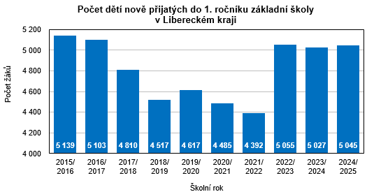 Základní vzdělávání ve školním roce 2024/2025 v Libereckém kraji zabezpečuje 199 škol (o 3 zařízení méně než v roce 2023/2024), ve kterých bylo zřízeno 2 250 tříd (meziročně +3 třídy). Tyto školy navštěvuje 42 946 žáků (tj. o 194 žáků a 0,4 % méně než ve školním roce 2023/2024), z toho 24 519 žáků (57,1 %) navštěvuje 1. stupeň. Stejně jako v roce 2023/2024 se tak i v tomto školním roce počet žáků na základních školách v našem kraji snížil. Jednu třídu navštěvuje v průměru 19,1 žáka, o rok dříve to bylo 19,2 žáka. Do 1. ročníku bylo nově přijato 5 045 žáků, v tom 0,6 % žáků bylo mladších 6 let, 76,0 % žáků bylo šestiletých a 23,4 % sedmiletých a starších.