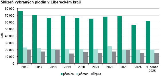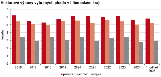 Podle tohoto odhadu by v Libereckém kraji mohlo být sklizeno celkem 98 175 tun základních obilovin při výnosu 5,37 tun/ha. Při porovnání s loňskou sklizní to znamená nárůst sklizně o 8,1 % (+7 360 tun) a výnosu o 2,9 % (+0,15 tun/ha). Produkce stěžejní obiloviny pšenice ozimé se v tuto chvíli očekává ve výši 60 496 tun, tj. meziročně o 12,2 % (6 569 tun) více, její výnosnost by se mohla navýšit o 0,2 % na 5,88 tun/ha. Meziročně více by se mělo urodit také ovsa (+836 tun, tj. +18,7 % na 5 297 tun), žita (+571 tun, tj. +14,8 % na 4 423 tun) i ječmene (+243 tun, tj. +1,2 % na 20 239 tun). Meziročně méně by naopak mělo být sklizeno tritikale (-134 tun, tj. -2,2 % na 6 072 tun). Ve srovnání se skutečností roku 2024 se v letošním roce předpokládá také vyšší úroda řepky – při hektarovém výnosu 2,93 tun by mělo být sklizeno 15 619 tun (+5,5 %) této plodiny.
