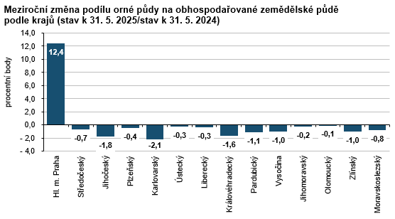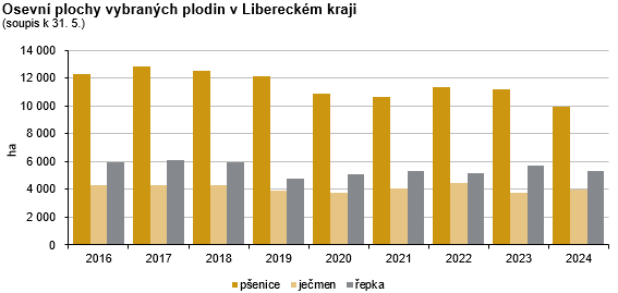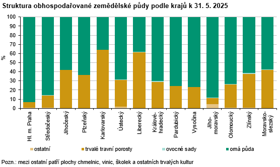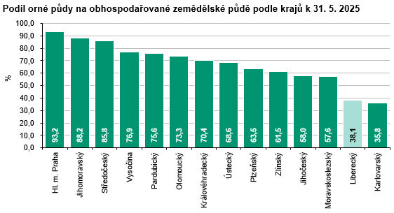 Výměra zemědělské půdy zjištěná šetřením o plochách osevů v Libereckém kraji k 31. 5. 2025 činila 101 318 ha, tj. meziročně o 2 427 ha (+2,5 %) více. Orná půda představovala 38 578 ha a ve srovnání s rokem 2024 se její výměra zvýšila o 604 ha (+1,6 %). Její podíl na zemědělské půdě v kraji dosáhl 38,1 %, republikový podíl činil 70,6 %. Trvalé travní porosty zaujímaly 61,0 % zemědělské půdy v kraji (republikový podíl 28,3 %) a jejich výměra se proti loňskému roku zvýšila o 1 978 ha (+3,3 %) na 61 763 ha. Plocha úhoru, po výrazném nárůstu souvisejícím se změnou dotačních podmínek v roce 2023, poklesla o 590 ha (-29,0 %) na 1 444 ha. Podíl úhoru na orné půdě tak v roce 2025 činil 3,7 %.