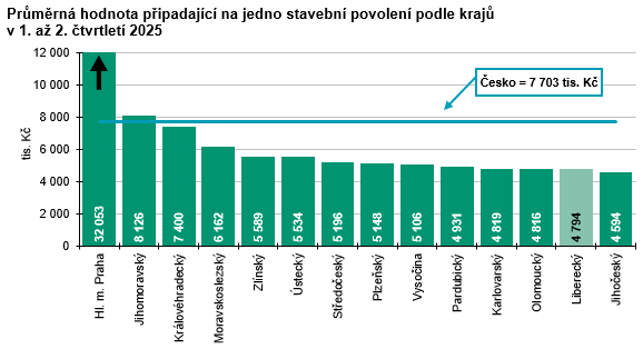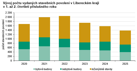 Orientační hodnota vydaných stavebních povolení v Libereckém kraji v 1. až 2. čtvrtletí 2025 dosáhla částky 6 639 mil. Kč a meziročně se snížila o 67 mil. Kč, tj. o 1,0 %. Většina prostředků bude proinvestovaná na budovy (80,0 %), objem těchto finančních prostředků se však meziročně snížil o 307 mil. Kč (-5,5 %) na 5 308 mil. Kč. Naopak rozsah prostředků na inženýrské stavby se meziročně zvýšil o 240 mil. Kč (+22,0 %) na 1 331 mil. Kč.