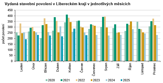 Od ledna do června letošního roku stavební úřady v Libereckém kraji vydaly celkem 1 385 stavebních povolení, tj. ve srovnání se stejným obdobím roku 2024 o 197 povolení a 12,5 % méně. Dosažený výsledek byl ovlivněn především negativním vývojem v dubnu (meziročně -88 povolení, tj. -28,8 %) a v lednu (-59 povolení, tj. -23,3 %), meziročně nižší počet stavebních povolení byl však vydán také v březnu (-12,1 %), v červnu (-9,9 %) a v únoru (-8,3 %). Meziročně vyšší investiční aktivita tak byla vykázána pouze v květnu (+27 povolení, tj. +10,4 %).