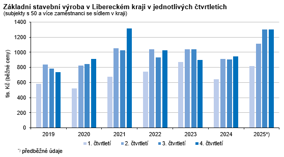 V roce 2025 mělo na území Libereckého kraje sídlo 11 středních a velkých stavebních podniků (podniky s 50 a více zaměstnanci). Základní stavební výroba (ZSV) v objemu 4 533 mil. Kč (v běžných cenách) zařadila Liberecký kraj v mezikrajském srovnání s 1,8% podílem na 3. nejnižší pozici. Meziročně se hodnota prací realizovaných středními a velkými podniky v kraji zvýšila o 1 123 mil. Kč, tj. o 32,9 %. Na uvedeném výsledku se větší měrou podílel nárůst tuzemských prací v oblasti pozemního stavitelství (+67,4 %), inženýrské stavitelství zaznamenalo 8,2% nárůst. V celkovém objemu ZSV byly práce v oblasti pozemního stavitelství zastoupeny 59,3 %, podíl inženýrského stavitelství dosáhl 40,7 %.