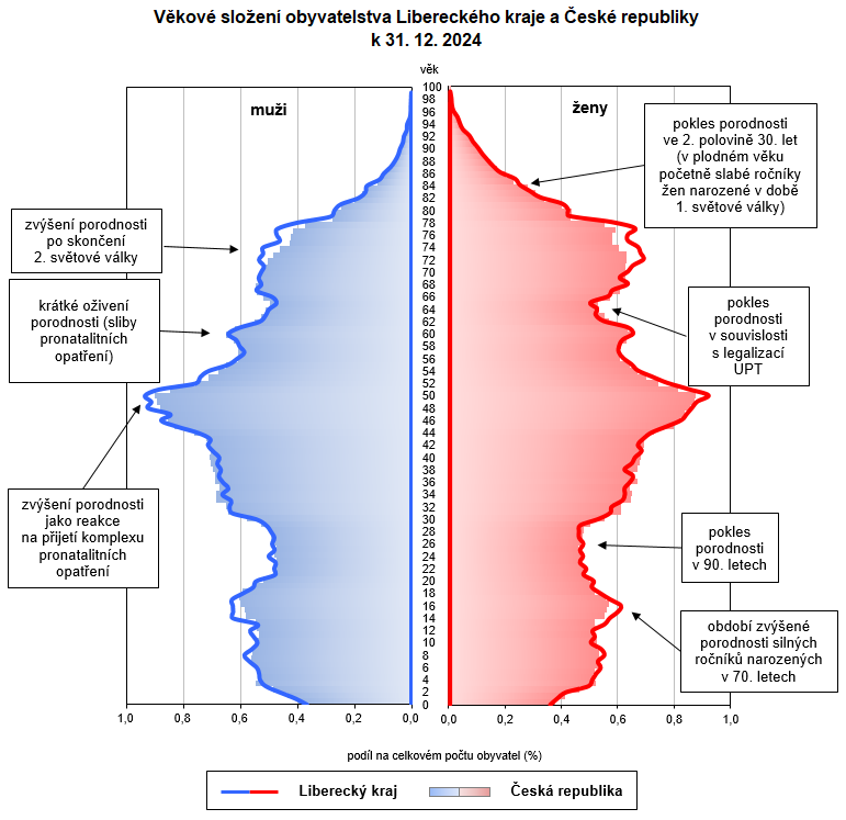 Věkové složení obyvatelstva Libereckého kraje a České republiky k 31. 12. 2024