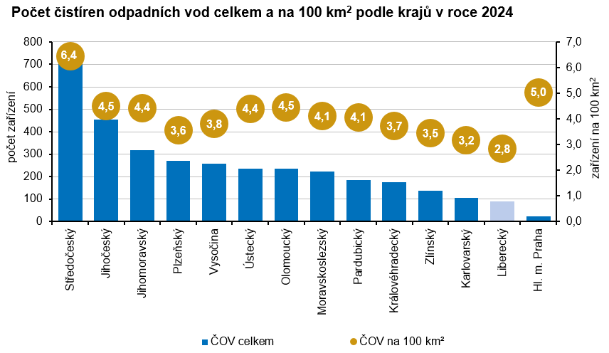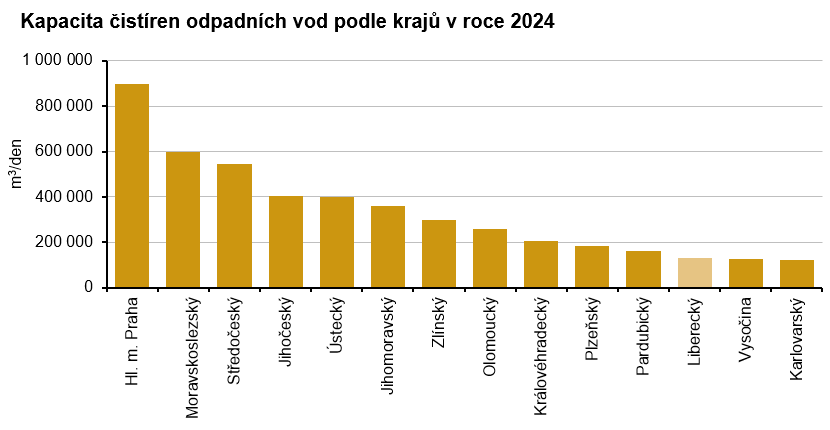 Na území Libereckého kraje ve sledovaném roce fungovalo 90 čistíren odpadních vod o celkové kapacitě 132 769 m3 za den. Nejvíce čistíren měl na svém území Středočeský kraj (704 zařízení), naopak tomu bylo v hlavním městě Praze (25 zařízení). Kapacita čistíren však byla nejvyšší v hlavním městě Praze (899 825 m3 za den), nejnižší výkon měla zařízení v Karlovarském kraji (120 849 m3 za den). Čistírny v našem regionu se z pohledu kapacity umístily na 3. nejnižší pozici. Množství vyprodukovaných kalů v regionu v roce 2024 dosáhlo 5 719 tun sušiny, většina byla zneškodněna kompostováním (95,4 %).