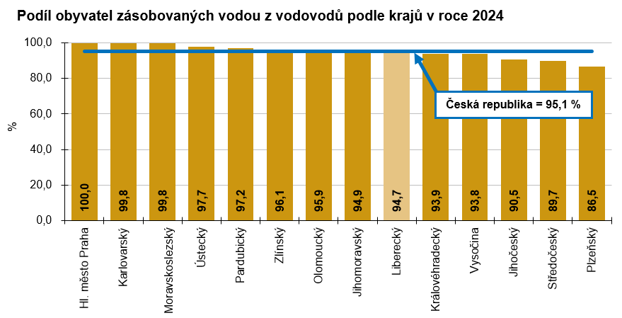 Vodou z veřejného vodovodu bylo v roce 2024 zásobováno 425 480 osob, tj. 94,7 % obyvatel Libereckého kraje. V mezikrajském srovnání to pro náš region znamenalo 6. nejnižší příčku. Nejméně obyvatel napojených na vodovod evidoval Plzeňský kraj (86,5 %), naopak 100% napojení vykázalo pouze hlavní město Praha.