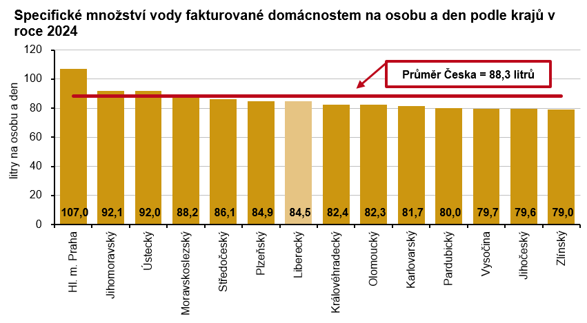 Specifické množství vody fakturované celkem v roce 2024 v Libereckém kraji dosáhlo 118,9 litrů na osobu za den. V úhrnu za Česko spotřeba vody činila 128,9 litrů na osobu a den. Napříč kraji se ukazatel pohyboval v rozmezí od 113,6 litrů ve Zlínském kraji do 158,4 litrů na osobu za den v hlavním městě Praze. Spotřeba za Liberecký kraj byla v mezikrajském srovnání 2. nejnižší.