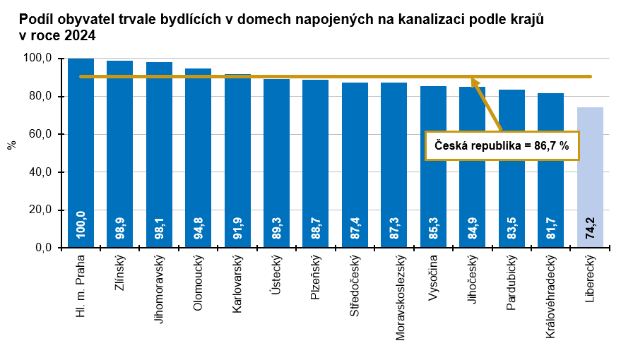 Pozn.: Zdrojem dat o vodovodech a kanalizacích za rok 2024 je administrativní zdroj dat Ministerstva zemědělství. Data z těchto evidencí jsou sbírána podle jiné metodiky, než tomu bylo doposud. S ohledem k těmto metodickým rozdílům nejsou nyní publikované údaje srovnatelné s předchozími roky.