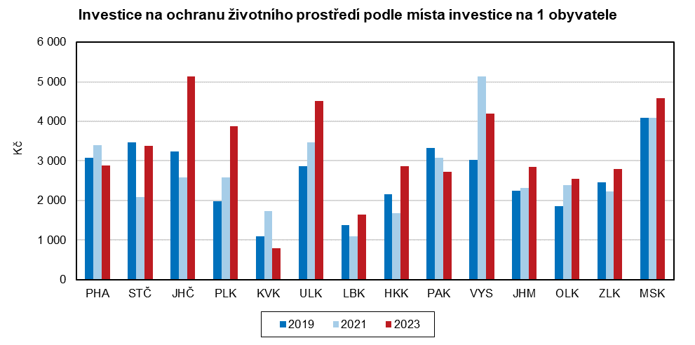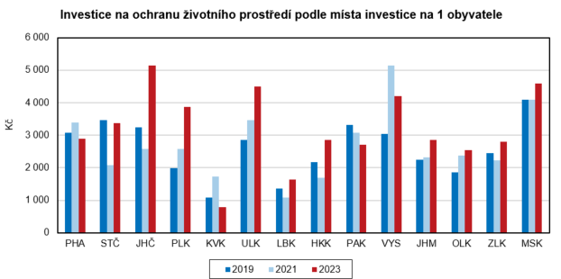 Investice na ochranu životního prostředí vynaložené na území Libereckého kraje (bez ohledu na sídlo investora) dosáhly v roce 2023 v porovnání s ostatními kraji 2. nejnižší částky, a to 739,8 mil. Kč. Meziročně byly nižší o 40,9 mil. Kč (-5,2 %). Proti roku 2022 byl nižší objem vynaložených investic na území regionu zjištěn také v dalších 5 krajích, z toho nejvýraznější pokles zaznamenal Karlovarský kraj (-60,0 %). Ve zbývajících krajích se investice na ochranu životního prostředí navýšily, nejvíce v Ústeckém kraji (+39,0 %). V přepočtu na 1 obyvatele dosáhly sledované investice v našem kraji 1 642,4 Kč, tato hodnota je v rámci regionů po Karlovarském kraji (794,5 Kč) 2. nejnižší. V porovnání s republikovým průměrem (3 366,2 Kč) je o 1 723,8 Kč nižší. Nejvíce prostředků na 1 obyvatele bylo v roce 2023 proinvestováno v Jihočeském kraji, tj. 5 140,2 Kč.