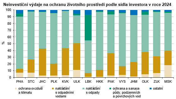 V oblasti neinvestičních nákladů byly v roce 2024 největší položkou výdaje spojené s nakládáním s odpady, které představovaly 48,5 % jejich celkové hodnoty. Oproti roku 2023 byl zaznamenán nárůst těchto výdajů o 9,6 %. Druhou nejvýznamnější položku neinvestičních nákladů představuje ochrana a sanace půdy, podzemních a povrchových vod (38,0 %), v tomto případě se objem nákladů zvýšil o 4,7 %.