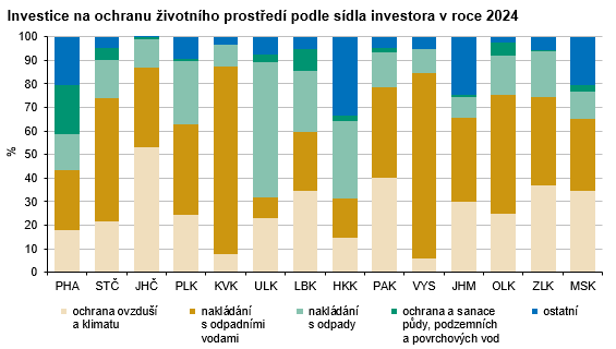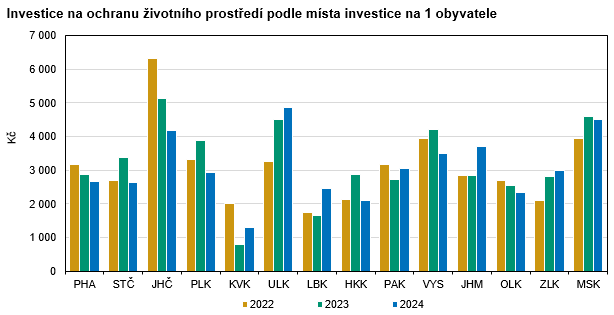 Investice na ochranu životního prostředí vynaložené na území Libereckého kraje (bez ohledu na sídlo investora) dosáhly v roce 2024 v porovnání s ostatními kraji 2. nejnižší částky, a to 1 107,5 mil. Kč. Meziročně byly vyšší o 367,7 mil. Kč (+49,7 %). Proti roku 2023 byl vyšší objem vynaložených investic na území regionu zjištěn také v dalších 5 krajích, z toho nejvýraznější nárůst zaznamenal Karlovarský kraj (+63,5 %). Ve zbývajících krajích se investice na ochranu životního prostředí snížily, nejvíce v Královéhradeckém kraji (-26,7 %). V přepočtu na 1 obyvatele dosáhly sledované investice v našem kraji 2 464,5 Kč, tato hodnota je v rámci regionů 4. nejnižší. V porovnání s republikovým průměrem (3 229,3 Kč) je o 764,7 Kč nižší. Nejvíce prostředků na 1 obyvatele bylo v roce 2024 proinvestováno v Ústeckém kraji (4 851,0 Kč), nejméně pak v kraji Karlovarském (1 306,7 Kč).