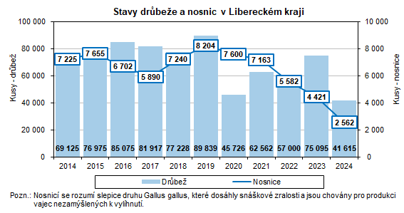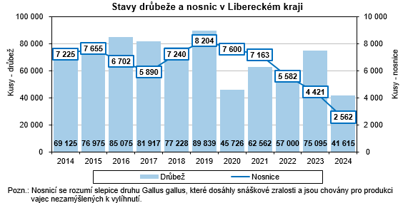 Stavy drůbeže se v Libereckém kraji v roce 2024 meziročně snížily o 44,6 %, počty nosnic se snížily o 42,0 %.
