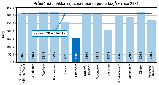 Ve srovnání s rokem 2023 se produkce konzumních vajec v našem kraji snížila o 51,9 % (398 tis. kusů) na 369 tis. kusů. Průměrná snáška na nosnici činila 154,3 vajec (v rámci mezikrajského srovnání nejnižší hodnota) a meziročně se snížila o 21,5 kusu (-12,2 %). Nejvyšší průměrná snáška vajec byla zaznamenána ve Zlínském kraji (324,7 kusů).