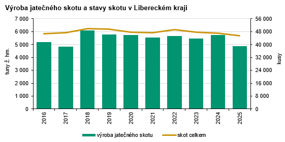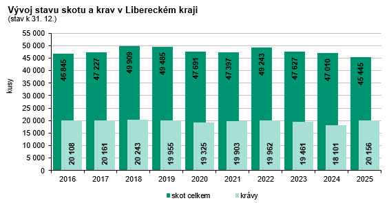 K poslednímu dni roku 2025 bylo zemědělci v Libereckém kraji chováno 45 445 kusů skotu, tj. o 1 565 kusů (3,3 %) méně než na konci roku 2024. Liberecký kraj tak patřil k dalším 9 krajům, ve kterých se stavy těchto zvířat proti roku 2024 snížily – nejvýraznější propad vykázal Karlovarský kraj (-5,3 %). Meziročně vyšší stavy skotu evidovaly pouze 3 kraje – Jihomoravský (+10,0 %), Zlínský (+1,2 %) a Moravskoslezský (+0,1 %).