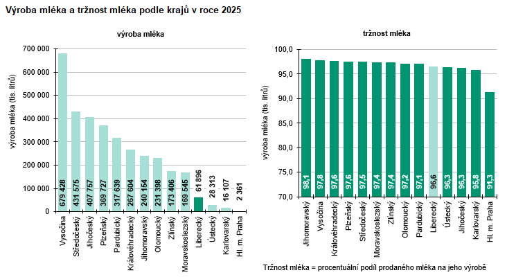 Výroba mléka v Libereckém kraji dosáhla 59 768 tis. litrů a oproti roku 2024 byla nižší o 3 947 tis. litrů (-6,2 %). Na celorepublikové produkci mléka (3 396 909 tis. litrů) se kraj podílel 1,8 %, což je 4. nejnižší podíl. Největším producentem mléka byl tradičně Kraj Vysočina s 679 428 tis. litry a 20,0% podílem, nejnižší produkci mléka vykázalo hlavní město Praha (2 361 tis. litrů, 0,1% podíl).