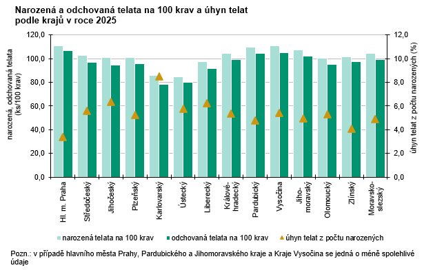 V průběhu roku 2025 se v Libereckém kraji narodilo 19 623 telat (o 3,6 % více než v roce 2024), úspěšně bylo odchováno 18 396 telat (meziročně +3,3 %). Na 100 krav tedy připadlo 97,4 narozených (meziročně +2,6 %) a 91,3 odchovaných telat (meziročně +2,3 %). Úhyn telat do 3 měsíců z počtu narozených činil 6,3 % (meziročně +0,3 p. b.).