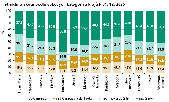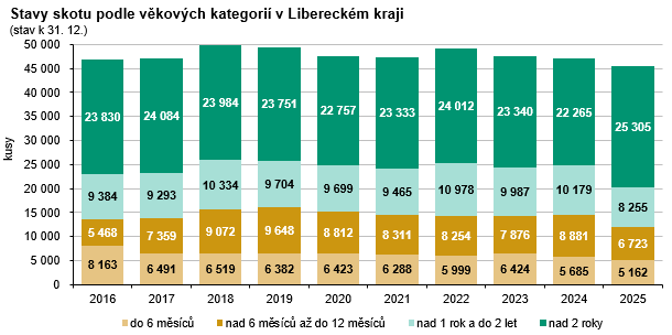 Téměř 56 % z uvedeného stavu skotu v Libereckém kraji představoval skot starší 2 let, jeho počet se meziročně zvýšil o 13,7 % na 25 305 kusů. V rámci této věkové kategorie se nejvýrazněji zvýšily stavy krav ostatních (+2 248 kusů, tj. +21,0 % na 12 950 kusů), nižší počet byl pak zaznamenán pouze u krav dojených (-193 kusů, tj. -2,6 % na 7 206 kusů). Krávy dojené tvořily 15,9 % celkového stavu skotu, krávy ostatní (tzn. krávy bez tržní produkce mléka) představovaly 28,5 %. V ostatních věkových kategoriích došlo k meziročnímu poklesu stavů, tj. v případě skotu do 1 roku bylo evidováno snížení o 2 681 kusů (-18,4 %) na 11 885 kusů, u stavu skotu ve věku 1 rok až 2 roky pokles dosáhl 18,9 % (-1 924 kusů) a v regionu tak bylo chováno 8 255 kusů takto starého skotu.