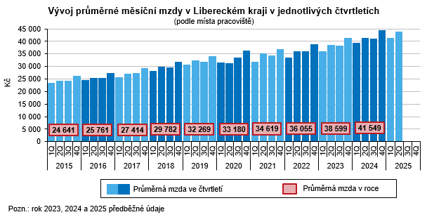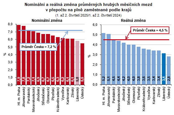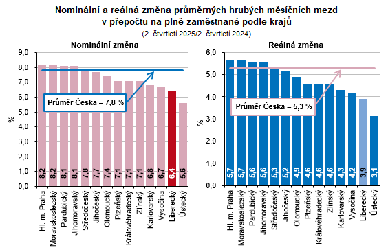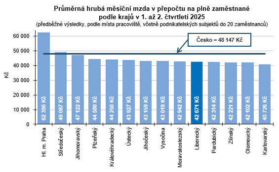 Průměrná hrubá měsíční nominální mzda přepočtená na plně zaměstnané v 1. až 2. čtvrtletí 2025 v Libereckém kraji dosáhla částky 42 671 Kč, meziročně se tak zvýšila o 2 345 Kč (+5,8 %). Vzhledem k 2,6% navýšení spotřebitelských cen v Česku v tomto období však mzda v kraji reálně vzrostla o 3,1 %. Oproti celorepublikovému průměru (48 147 Kč) byla uvedená mzda nižší o 5 476Kč, o 19 724 Kč zaostávala za nejvyšší krajskou průměrnou mzdou vyplácenou v hlavním městě Praze (62 395 Kč). Nejnižší průměrnou mzdu pobírali zaměstnanci v Karlovarském kraji (40 726 Kč), mzda v Libereckém kraji byla 5. nejnižší. Meziročně nominálně vyšší mzdy vykázaly všechny kraje. Nejvýraznější absolutní i relativní změna byla zjištěna v hlavním městě Praze (+4 587 Kč, resp. +7,9 %). S ohledem na výše uvedený růst spotřebitelských cen byly mzdy ve všech krajích vyšší také reálně – navýšení se pohybovalo v rozmezí od +2,8 % v Ústeckém kraji do +5,2 % v hlavním městě Praze. Absolutní přírůstek průměrné mzdy v celém Česku představoval 3 246 Kč, nominálně se zvýšila o 7,2 %, ale reálně pak o 4,5 %.