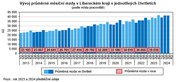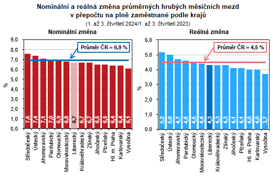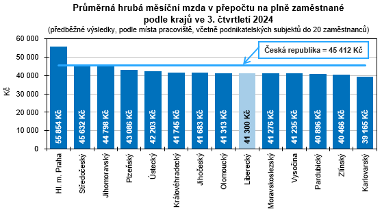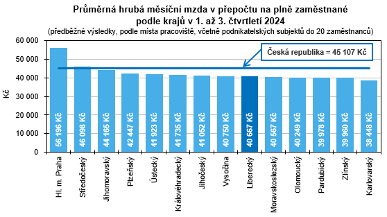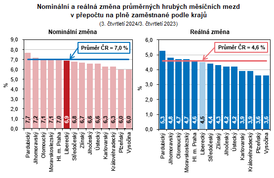 Průměrná hrubá měsíční nominální mzda přepočtená na plně zaměstnané v 1. až 3. čtvrtletí 2024 v Libereckém kraji dosáhla částky 40 667 Kč, meziročně se tak navýšila o 2 555 Kč (+6,7 %). Vzhledem k 2,3% navýšení spotřebitelských cen v České republice v tomto období však mzda v kraji reálně vzrostla o 4,3 %. Oproti celorepublikovému průměru (45 107 Kč) byla uvedená mzda nižší o 4 440 Kč, o 15 529 Kč zaostávala za nejvyšší krajskou průměrnou mzdou vyplácenou v hlavním městě Praze (56 196 Kč). Nejnižší průměrnou mzdu pobírali zaměstnanci v Karlovarském kraji (38 448 Kč), mzda v Libereckém kraji byla 6. nejnižší. Meziročně nominálně vyšší mzdy vykázaly všechny kraje. Nejvýraznější absolutní změna byla zjištěna v hlavním městě Praze (+3 367 Kč), relativní pak ve Středočeském kraji (+7,6 %). S ohledem na výše uvedený růst spotřebitelských cen byly mzdy ve všech krajích vyšší také reálně – navýšení se pohybovalo v rozmezí od 3,7 % v Kraji Vysočina do 5,2 % ve Středočeském kraji. Absolutní přírůstek průměrné mzdy v celé České republice představoval 2 921 Kč, nominálně se zvýšila o 6,9 %, ale reálně pak o 4,5 %.