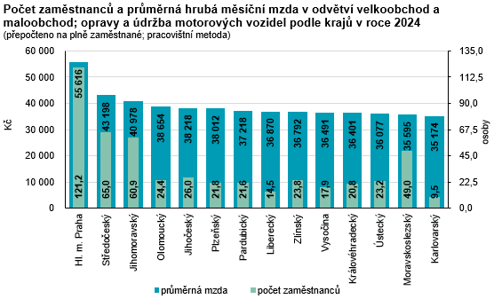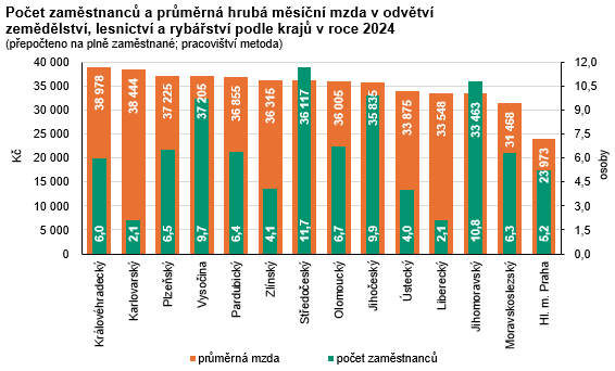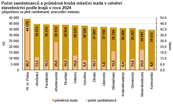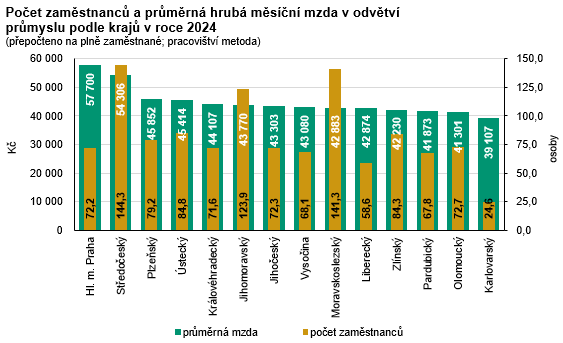 Průměrná mzda v úhrnu za Česko v roce 2024 činila 45 644 Kč. Nad tímto průměr se pohybovala pouze mzda v hlavním městě Praze (57 779 Kč) a Středočeském kraji (46 298 Kč). Nejvyšší mzdu v případě většiny odvětví pobírali zaměstnanci v hlavním městě Praze, výjimkou bylo odvětví Zemědělství, lesnictví a rybolovu, u kterého byla nejvyšší mzda evidována v Králové-hradeckém kraji (38 978 Kč). V případě Zpracovatelského průmyslu se jednalo o Středočeský kraj (54 711 Kč) a u odvětví Administrativních a podpůrných činností pobírali nejvyšší mzdy zaměstnanci z Jihomoravského kraje (36 009 Kč). V rámci mezikrajského žebříčku byla zaměstnancům z Libereckého kraje vyplácena nejnižší mzda v případě odvětví Peněžnictví a pojišťovnictví a Zásobování vodou; činnosti související s odpadními vodami, odpady a sanacemi. Nejnižší mzdy v odvětví zemědělské činnosti evidovalo hlavní město Praha (23 973 Kč). Karlovarský kraj vykázal v rámci mezikrajského srovnání nejnižší mzdovou úroveň v případě průmyslových odvětví (39 107 Kč) a Zpracovatelského průmyslu (38 290 Kč), Stavebnictví (34 533 Kč), odvětví Velkoobchodu a maloobchodu; oprav a údržby motorových vozidel (35 174 Kč) a odvětví Zdravotní a sociální péče (45 363 Kč). Kraj Vysočina evidoval nejnižší mzdy v odvětví Činností v oblasti nemovitostí (29 976 Kč), Vzdělávání (42 306 Kč), Kulturní, zábavní a rekreační činnosti (34 142 Kč). V odvětví Výroby a rozvodu elektřiny, plynu, tepla a klimati-zovaného vzduchu (49 168 Kč), Veřejná správa a obrana; povinné sociální zabezpečení (43 670 Kč) a Doprava a skladování (34 840 Kč) byl nejnižší průměrný výdělek zjištěn ve Zlínském regionu. Zaměstnanci z odvětví Ubytování, stravování a pohostinství evidovali nejnižší průměrné mzdy v Moravskoslezském kraji (23 476 Kč), v odvětví Informačních a komunikačních činností pak v Jihočeském kraji (49 264 Kč). Profesní, vědecké a technické činnosti (39 934 Kč) a také práce v odvětví Těžby a dobývání (38 562 Kč) byly nejméně ohodnoceny v Královéhradeckém kraji, zaměstnanci z odvětví Administrativních a podpůrných činností pobírali nejnižší mzdu v Olomouckém kraji (24 530 Kč).