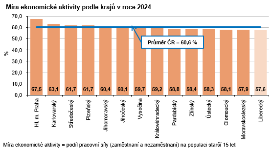 Míra ekonomické aktivity, tj. podíl počtu zaměstnaných a nezaměstnaných (pracovní síly) na počtu všech osob 15letých a starších, v Libereckém kraji v roce 2024 dosáhla 57,6 %. Meziročně se tento podíl nepatrně o 0,3 p. b. zvýšil. V porovnání s ostatními kraji Česka byla uvedená hodnota jednoznačně nejnižší. Nejvyšší míru ekonomické aktivity vykázalo hlavní město Praha (67,5 %) a celorepublikový průměr činil 60,6 %.