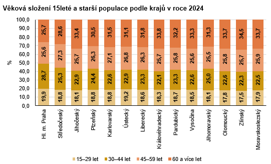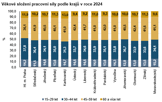 Mimo pracovní sílu bylo v roce 2024, jak již bylo výše zmíněno, v našem kraji 155,3 tis. osob ve věku 15 a více let, tj. 95,3 tis. žen (61,4 %) a 60,0 tis. mužů (38,6 %). Věková struktura těchto osob v zásadě zrcadlí hlavní důvody ekonomické neaktivity těchto osob – největší část tak představují osoby ve věku 60 a více let (62,5 %), tedy osoby, které jsou již převážně v penzi. S výrazným odstupem následují mladí lidé ve věku 15 až 29 let (24,2 %).