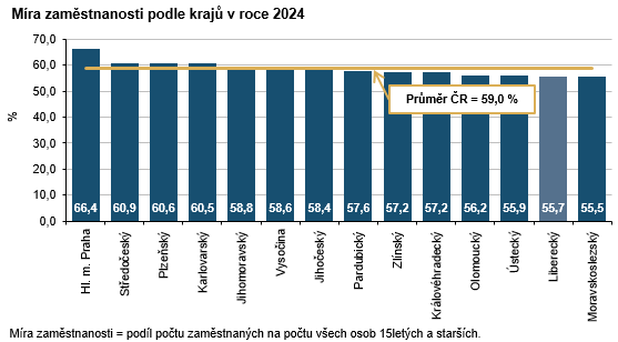 Míra zaměstnanosti, tj. podíl počtu zaměstnaných na počtu všech osob 15letých a starších, v roce 2024 v Libereckém kraji činila 55,7 %, tedy proti roku 2023 o 0,4 p. b. více. Napříč kraji se míra zaměstnanosti pohybovala v rozmezí od 55,5 % v Moravskoslezském kraji do 66,4 % v hlavním městě Praze. Hodnota za Liberecký kraj byla v tomto srovnání 2. nejnižší.