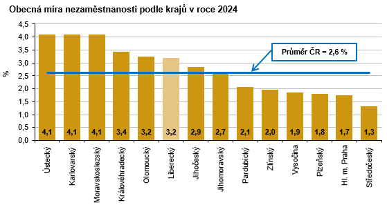 Obecná míra nezaměstnanosti v roce 2024 v našem kraji činila 3,2 %, meziročně se tak její hodnota snížila o 0,2 p. b. V porovnání s ostatními kraji Česka se jedná o 6. nejvyšší hodnotu, ve srovnání s celorepublikovým průměrem je hodnota za náš kraje o 0,6 p. b. vyšší. Napříč regiony Česka se pak obecná míra nezaměstnanosti pohybuje v rozmezí od 1,3 % ve Středočeském do 4,1 % v Ústeckém a také Karlovarském a Moravskoslezském kraji. Hodnota obecné míry nezaměstnanosti meziročně vzrostla v 8 regionech, nejvýrazněji v Jihočeském kraji (+1,1 p. b.). Liberecký kraj patřil k dalším 5 regionům, které zaznamenaly meziroční pokles obecné míry nezaměstnanosti, nejvíce se pak nezaměstnanost proti roku 2023 snížila ve Středočeském kraji (-0,4 p. b.).