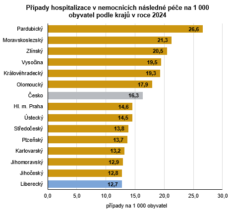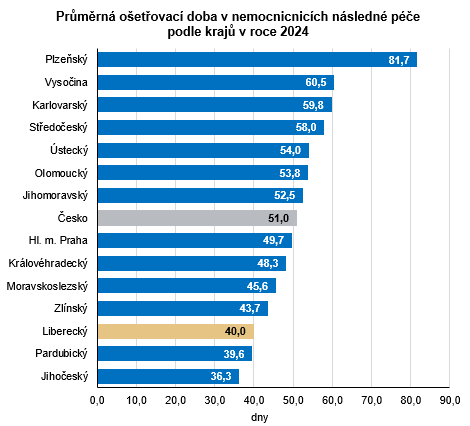 Nemocnice následné péče zastupovalo v našem kraji 1 zařízení se 79 lůžky. V roce 2024 toto zařízení evidovalo 5 715 případů hospitalizace, tj. 12,7 případů na 1 000 obyvatel. Pacienti byli v tomto zařízení ošetřováni celkem 228 358 dní, tj. 508,2 dnů na 1 000 obyvatel, průměrná ošetřovací doba trvala 40,0 dní. Nejvíce případů hospitalizace v přepočtu na 1 000 obyvatel vykázal v roce 2024 Pardubický kraj (26,6 případů), nejméně právě náš region. Průměrná ošetřovací doba pak byla nejdelší v Plzeňském kraji (81,7 dnů), nejkratší v Jihočeském regionu (36,3 dnů). Průměrná ošetřovací doba zjištěná za Liberecký kraj byla 3. nejkratší.
