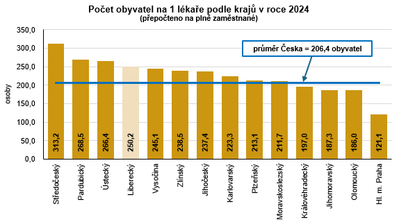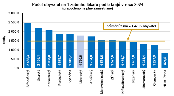 V přepočtu na 1 lékaře (přepočteno na plně zaměstnané) připadlo v Libereckém kraji v roce 2024 250,2 obyvatel, tj. oproti roku 2023 o 23,1 obyvatele více. Nejvíce obyvatel na 1 lékaře připadlo ve Středočeském kraji (313,2 obyvatel), naopak tomu s hodnotou 121,1 obyvatel bylo v hlavním městě Praze. Hodnota za Liberecký kraj obsadila v tomto srovnání 4. nejvyšší příčku, celorepublikový průměr činil 206,4 obyvatel na 1 lékaře. Podobně tomu bylo také v případě zubních lékařů, když se hodnota ukazatele pohybovala v rozmezí od 824,5 obyvatel na 1 dentistu v hlavním městě Praze do 2 455,3 obyvatel ve Středočeském kraji. Liberecký kraj se v tomto srovnání umístil na 6. nejvyšší pozici a v regionu tak na 1 zubního lékaře připadlo 1 780,8 obyvatel. Republikový průměr činil 1 479,5 obyvatel.