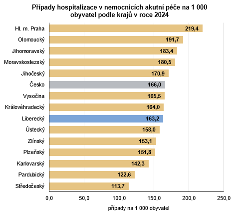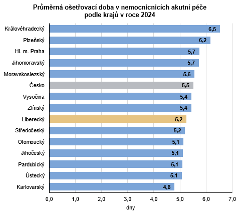 Nemocnice poskytující v kraji akutní péči v roce 2024 evidovaly celkem 73 320 případů hospitalizace (meziročně -0,2 %), tedy 163,2 případů na 1 000 obyvatel. V úhrnu pak byli pacienti ošetřováni 384 758 dnů (meziročně -1,4 %), což znamená 856,2 dne na 1 000 obyvatel. Průměrná ošetřovací doba činila 5,2 dne (meziročně -0,1 dne). Počet případů hospitalizace v nemocnicích akutní péče v přepočtu na 1 000 obyvatel se napříč regiony Česka pohyboval v rozmezí od 113,7 dnů ve Středočeském kraji do 219,4 dnů v hlavním městě Praze. Hodnota za Liberecký kraj byla 7. nejnižší. Nejdéle byli v průměru ošetřováni pacienti v Královéhradeckém kraji (6,5 dnů), nejkratší domu v nemocnici strávili obyvatelé z Karlovarského kraje (4,8 dnů). Průměrná ošetřovací doba pacientů v nemocnicích v Libereckém kraji byla 7. nejnižší.