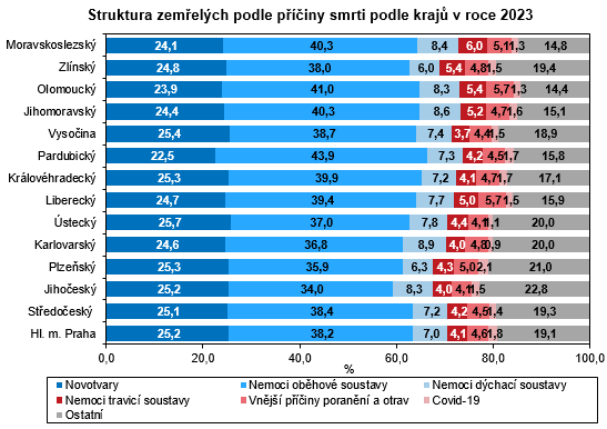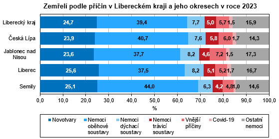 Také v okresech Libereckého kraje byly nejčastější příčinou úmrtí nemoci oběhové soustavy. Nejvyšší podíl zemřelých osob na následky těchto nemocí byl v roce 2023 vykázán v okrese Semily (44,0 %), nejnižší v okrese Liberec (37,5 %). Druhou nejčastější příčinou byly ve všech okresech novotvary, třetí nemoci dýchací soustavy. Až na čtvrtém místě dochází k rozdílu, v okresech Jablonec nad Nisou a Semily to jsou vnější příčiny, zatímco v okresech Česká Lípa a Liberec nemoci endokrinní, výživy a přeměny látek. Podíl sebevražd na vnější příčiny úmrtí je však nejvyšší v okrese Liberec (29,3 %) a nejnižší v okrese Jablonec nad Nisou (17,8 %).