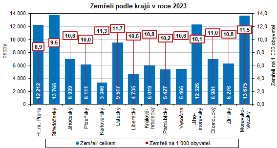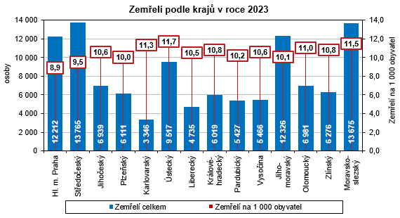 V průběhu roku 2023 v Libereckém kraji zemřelo celkem 4 735 osob, tj. o 278 osob méně než v roce 2022. Z dlouhodobého pohledu byla vyšší hodnota zemřelých, kromě třech předchozích let ovlivněných covidem-19, vykázána v roce 1992. Ve struktuře zemřelých z hlediska pohlaví z 52,3 % převažovali muži, z hlediska věku 33,2% podíl představovaly osoby ve věku 70–79 let a 29,0% podíl osoby ve věku 80–89 let. Nejvíce žen zemřelo ve věkové kategorii 80–89 let (775 žen, tj. 34,3 % z celkového počtu 2 258 zemřelých žen). Muži naopak nejčastěji umírali ve věku 70–79 let (927 mužů, tj. 37,4 % z celkového počtu 2 477 zemřelých mužů).