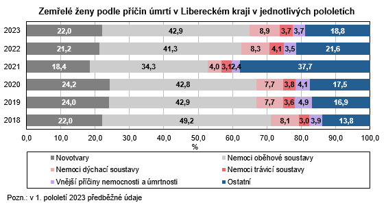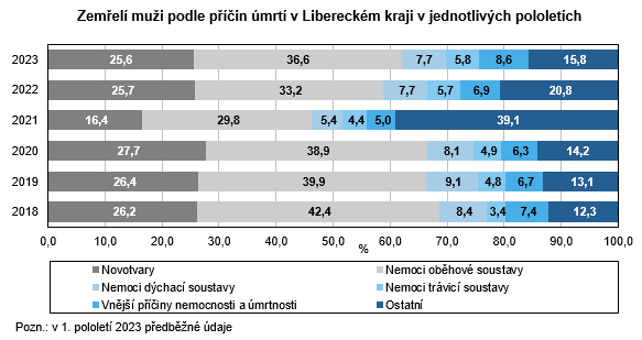 Podle předběžných výsledků v 1. pololetí roku 2023 v Libereckém kraji zemřelo 2 380 osob, tj. ve srovnání se stejným obdobím roku 2022 o 128 osob (5,1 %) méně. Zásluhu na tomto výsledku má opětovný pokles zemřelých na covid-19 (-157 osob, -81,8 %). Ve struktuře podle pohlaví převažovali z 52,3 % muži.