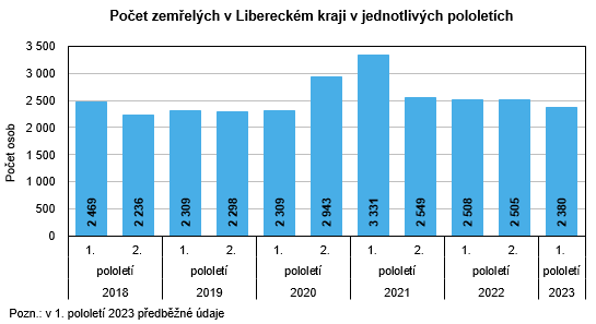 V 1. pololetí roku 2023 zemřelo v Libereckém kraji 2 380 osob, což je v meziročním srovnání o 5,1 % méně. U covidu 19 byl vykázán nejvyšší absolutní i relativní pokles zemřelých.