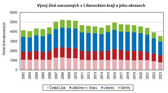 V průběhu roku 2023 se v Libereckém kraji živě narodilo 3 549 dětí, meziročně o 372 dětí (9,5 %) méně. V úhrnu za Českou republiku přišlo v roce 2023 na svět 91 149 živě narozených dětí, v tomto případě to bylo proti roku 2022 o 10 150 dětí (10,0 %) méně. Z pohledu krajů se nejvíce dětí narodilo v hlavním městě Praze (12 575 živě narozených, tj. 13,8 % republikového počtu). Více než 10 000 živě narozených zaznamenal také kraj Středočeský (12 249 dětí, tj. 13,4 %), a Jihomoravský (10 669 dětí, tj. 11,7 %). Nejnižší počty narozených vykázal kraj Karlovarský (2 131 dětí, tj. 2,3 %) a Liberecký (3,9 %). V přepočtu na 1 000 obyvatel se v České republice živě narodilo 8,4 dětí. Nad tímto průměrem se hodnota ukazatele pohybovala v hlavním městě Praze (9,1 ‰), v Jihomoravském kraji a Kraji Vysočina (shodně 8,7 ‰) a v Pardubickém kraji (8,5 ‰). I v tomto případě evidoval nejméně živě narozených Karlovarský kraj (7,2 ‰), hodnota za náš region ve výši 7,9 ‰ byla po hodnotě za Ústecký kraj (7,8 ‰) třetí nejnižší.