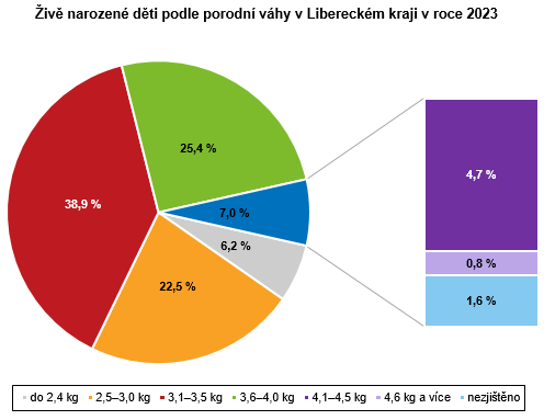 Porodní váha novorozenců narozených v Libereckém kraji v roce 2023 se nejčastěji pohybovala od 3,1 do 3,5 kg (1 380 živě narozených, tj. 38,9 % všech živě narozených), z toho absolutně nejvyšší počet dětí mělo porodní váhu 3,4 kg (338 živě narozených). Více než čtvrtina živě narozených vážila 3,6 až 4,0 kg (901 dětí) a více než pětina dětí měla porodní váhu 2,5 až 3,0 kg (799 dětí). S váhou 4,6 kg a více přišlo v loňském roce v našem kraji na svět 13 dětí, u 2 novorozenců váha činila 5,0 kg. Naopak porodní váhu 2,4 kg a méně mělo 6,2 % živě narozených, tedy 219 dětí. Většina novorozenců měřila 50 cm (492 živě narozených), následovaly děti se 49 cm (382 živě narozených) a 51 cm (344 živě narozených), 45 cm a méně měřilo 130 dětí. Naopak 54 a více cm byly naměřeny u 50 dětí – 1 novorozenec měřil dokonce 57 cm. U 1 339 dětí však nebyla délka uvedena, stejně tomu bylo u 56 dětí v případě porodní váhy.